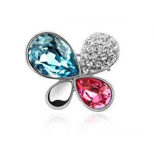 Lindo prendedor, en baño de oro blanco de 18 quilates, fino diseño de flor, con cristales rosa y azul corte pera, detalle plateado en acabado brillante e incrustaciones de cristales