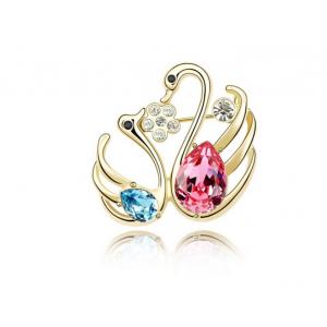 Prendedor en baño de oro amarillo de 18 quilates, diseño de cisnes, con cristales en color azul y rosa corte pera, flor blanca e inscrustaciones de cristales blancos y negros.