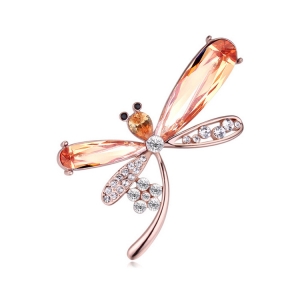 Prendedor en baño de oro rosa de 18 quilates, diseño de libélula, con cristales en color ámbar corte gota e incrustaciones de cristales blanco y negro. Fabricado en una estructura