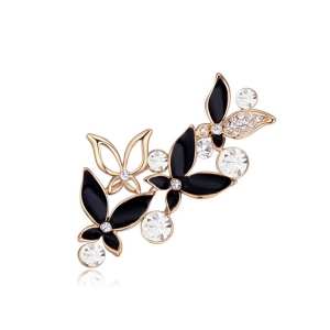 Prendedor en baño de oro amarillo de 18 quilates, diseño de mariposas, con esmaltado negro e incrustaciones de cristales en color blanco. Fabricado en una estructura de aleación de platino