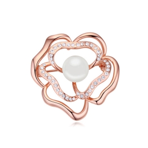 Prendedor en baño de oro rosa de 18 quilates, diseño de flor, con incrustaciones de cristales en color blanco y perla blanca. Fabricado en una estructura de aleación de platino