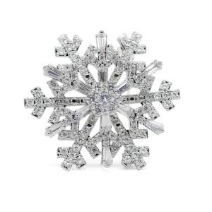 Lindo prendedor en baño de oro blanco de 18 quilates, diseño de copo de nieve con incrustraciones de cristales color blanco. Fabricado en una estructura de aleación de platino con