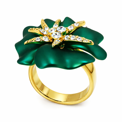Original anillo, en baño de oro amarillo de 18 quilates, diseño de flor en color verde metálico, detalles dorados e incrustaciones de cristales blancos. Fabricado en una estructura de aleación de platino con rodio sin níquel.