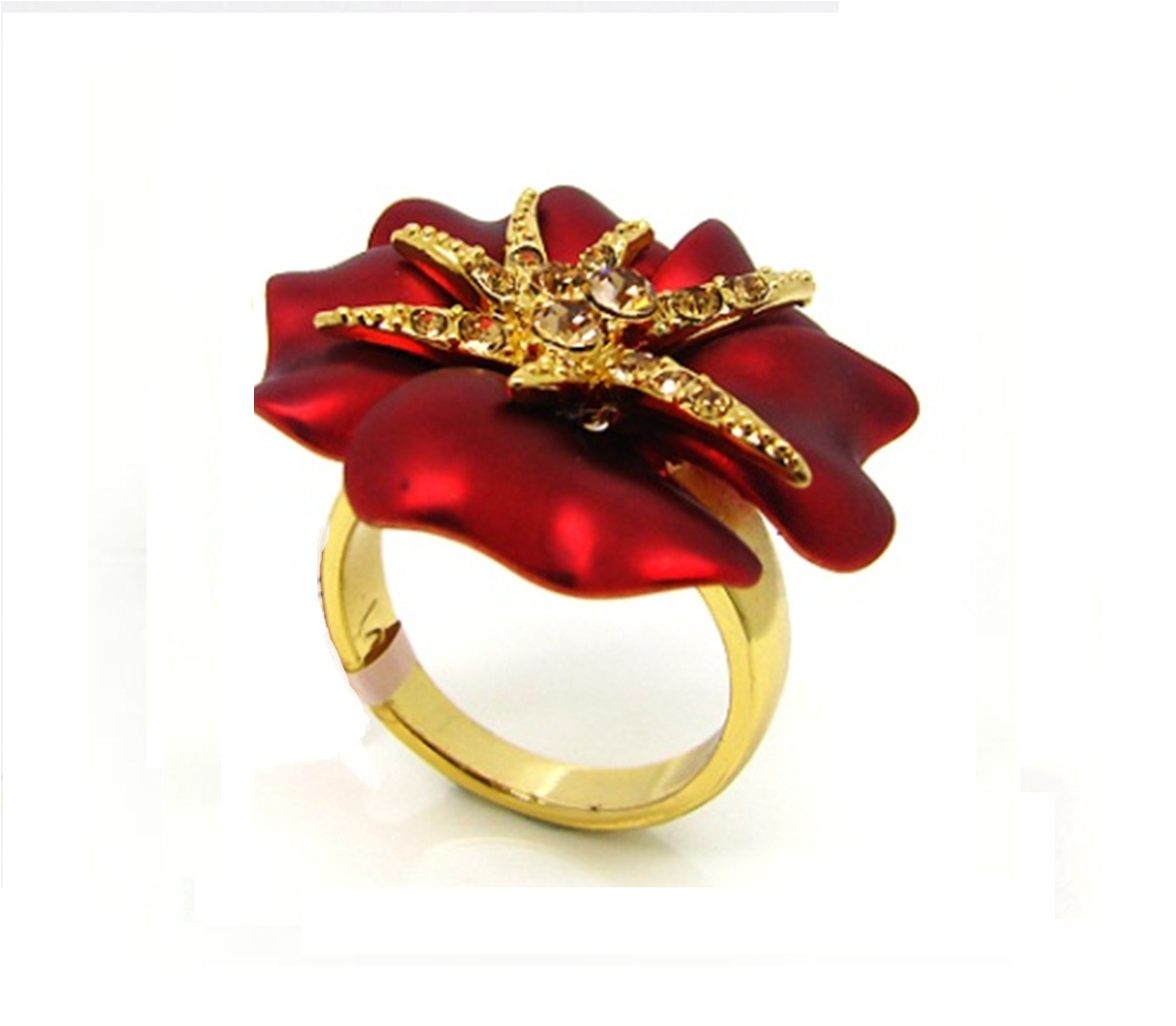 Original anillo, en baño de oro amarillo de 18 quilates, diseño de flor en color rojo metálico, detalles dorados e incrustaciones de cristales blancos. Fabricado en una estructura de aleación de platino con rodio sin níquel.