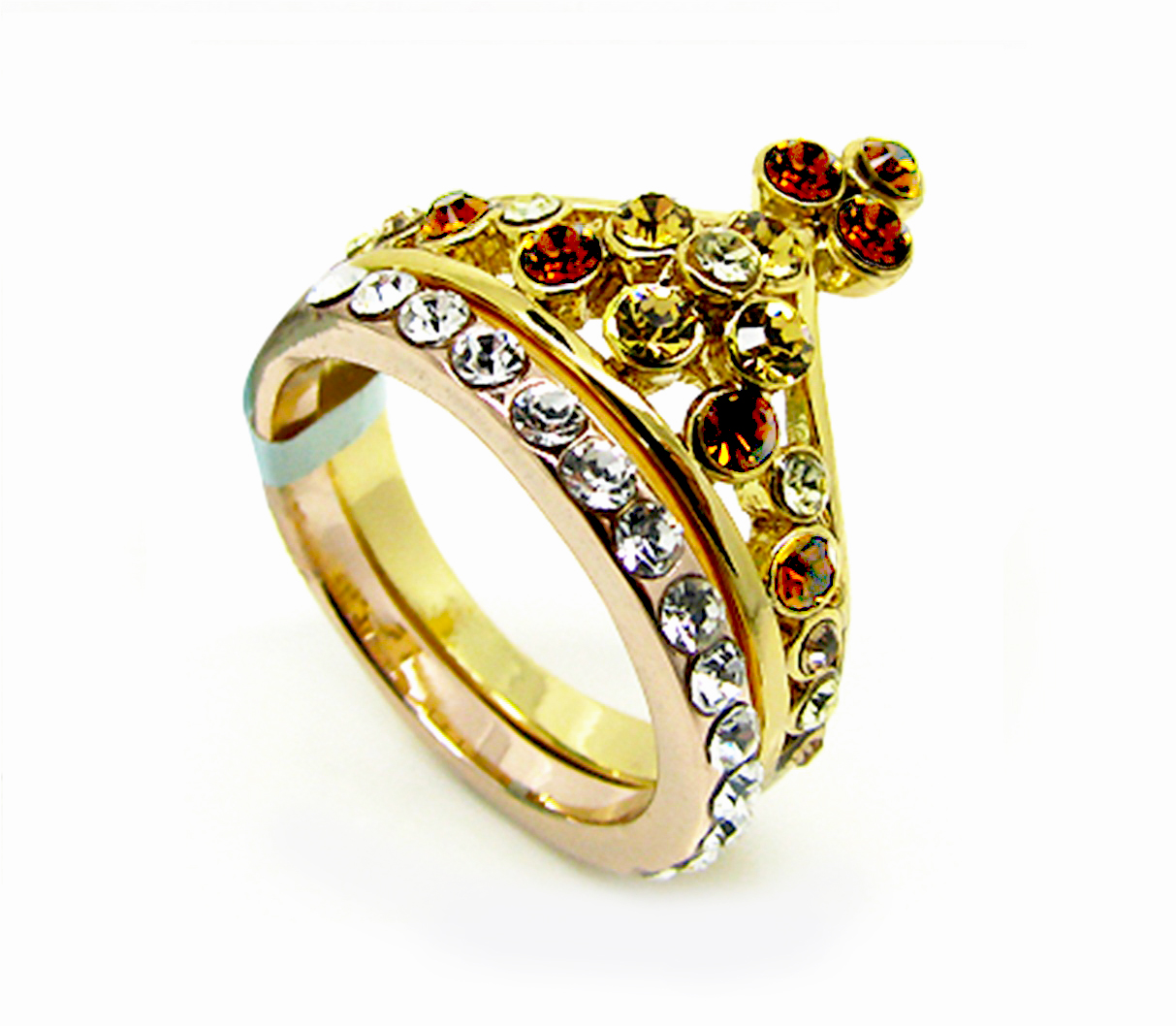 Bonito anillo doble, en baño de oro amarillo y rosa de 18 quilates, diseño de corona con cristales ámbar e incrustaciones de cristales blancos. Fabricado en una estructura de aleación de platino con rodio sin níquel.