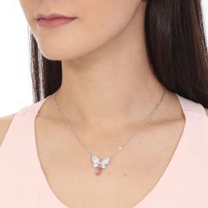 Collar en baño de oro blanco de 18 quilates , diseño de mariposa con cristal rosa corte marquesa, gota de cristal rosa e incrustaciones de cristales blancos. Fabricado en una estructura de aleación de platino con rodio sin níquel.