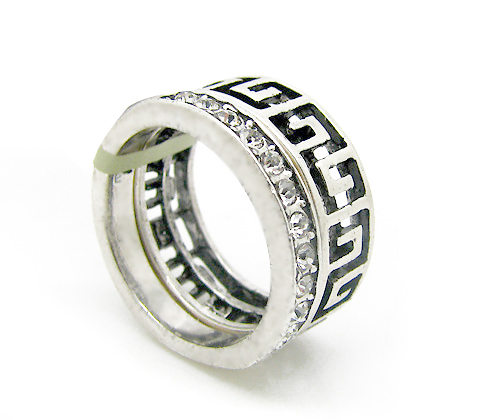 Precioso anillo, en baño de oro blanco de 18 quilates, diseño de grecas grabadas, con acabado antiguo e incrustaciones de cristales blancos. Fabricado en una estructura de aleación de platino con rodio sin níquel.