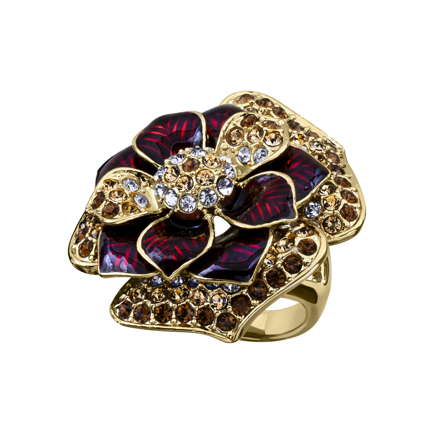 Elegante anillo, en baño de oro amarillo de 18 quilates, diseño de flor, acabado esmaltado en color vino e incrustaciones de cristales ámabr y blanco. Fabricado en una estructura de aleación de platino con rodio sin níquel.