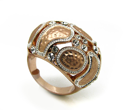 Elegante anillo, en baño de oro rosa y blanco de 18 quilates, con diseño calado, acbado martillado, detalles en relieve e incrustaciones de cristales blancos. Fabricado en una estructura de aleación de platino con rodio sin níquel.