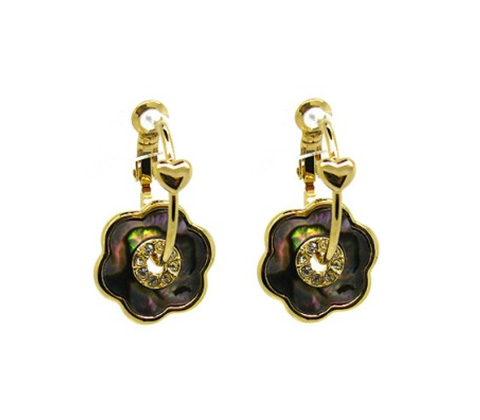 Bonitos aretes en baño de oro amarillo de 18 quilates con detalle de corazón dorado, flores nacaradas multicolor e incrustaciones de cristales blancos. Fabricado en una estructura de aleación de platino con rodio sin níquel.