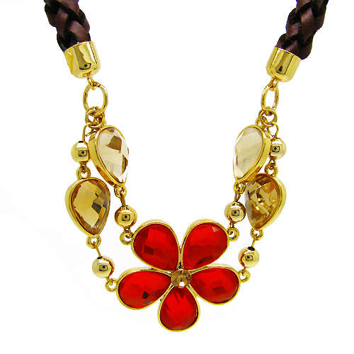 Lindo collar en baño de oro amarillo de 18 quilates con flor de cristal rojo, cristales ámbar corte pera, cadena tejida color café e incrustaciones de cristales blancos. Fabricado en una estructura de aleación de platino con rodio sin níquel.