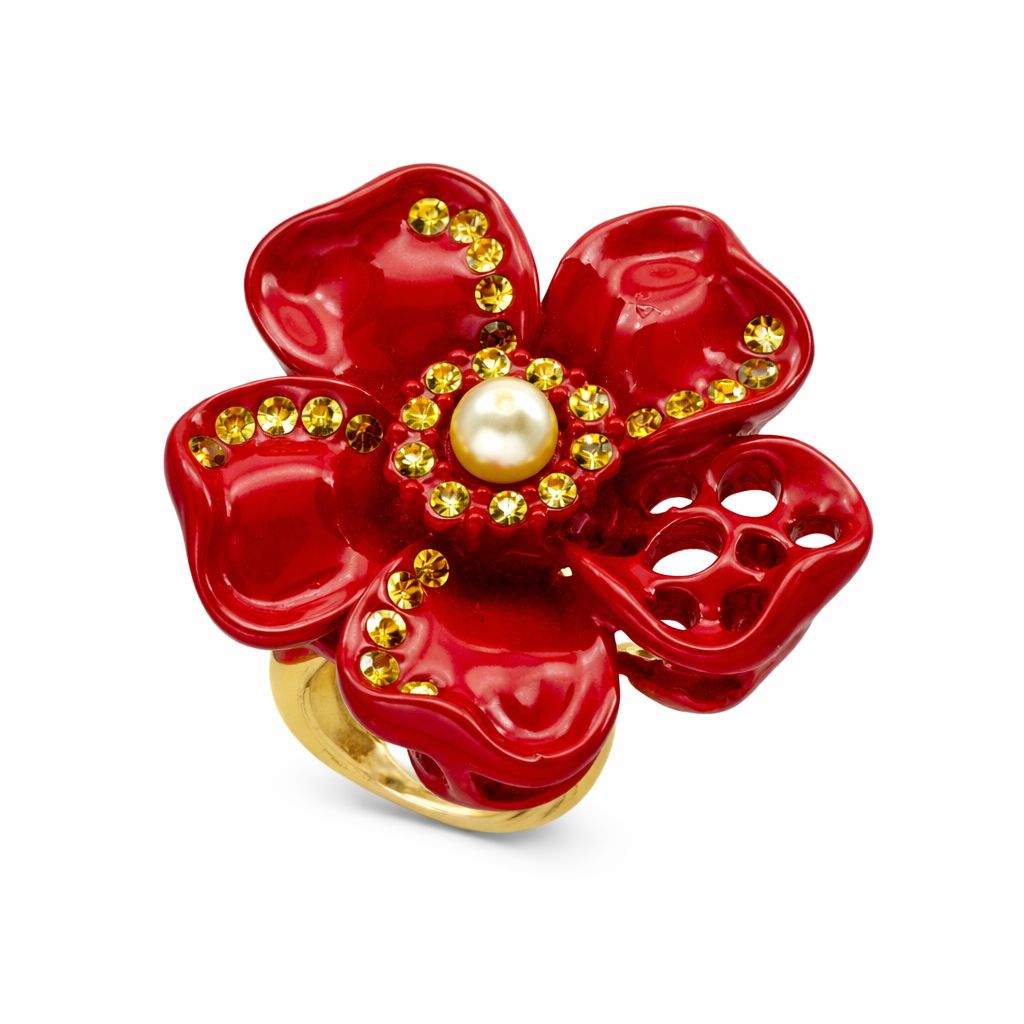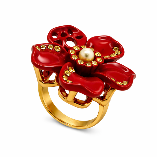Original anillo, en baño de oro amarillo de 18 quilates, diseño de flor en acabado rojo e4smaltado e incrustaciones de cristales blancos. Fabricado en una estructura de aleación de platino con rodio sin níquel.