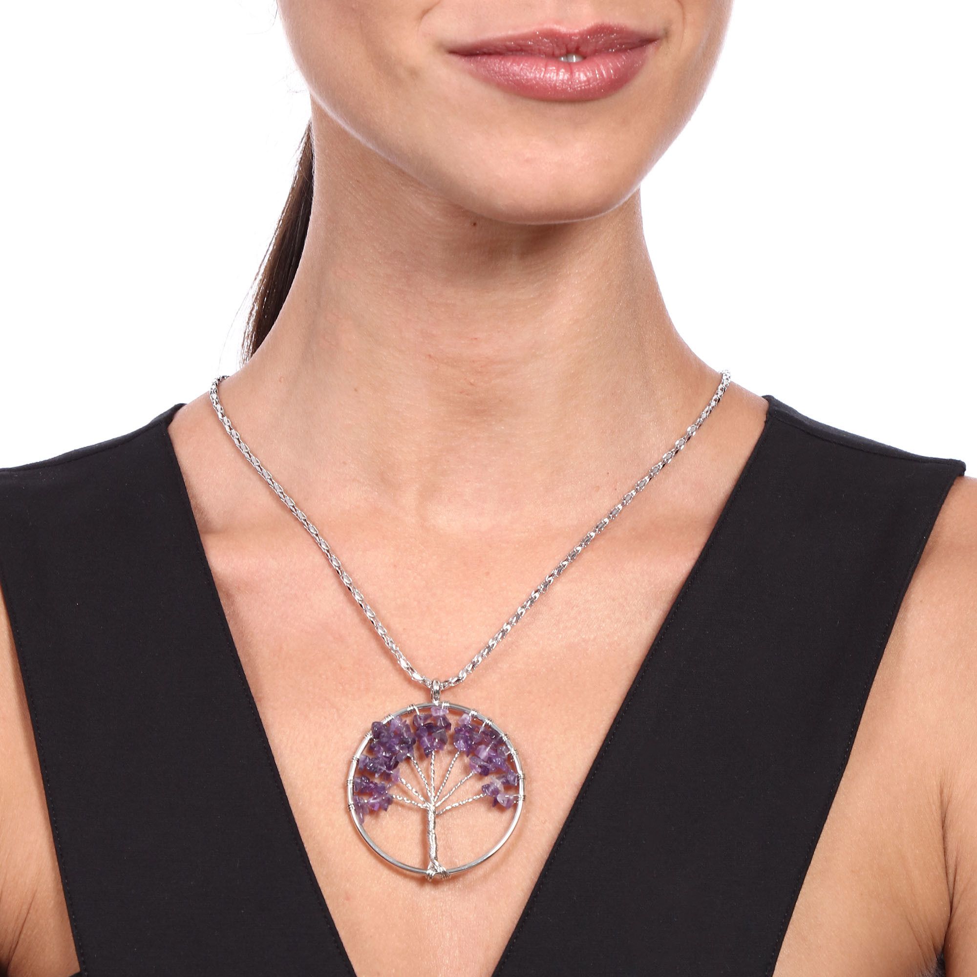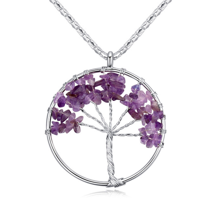 Dije con cadena en baño de oro blanco de 18 quilates, diseño de árbol con cuarzos en color morado. Fabricado en una estructura de aleación de platino con rodio sin níquel.