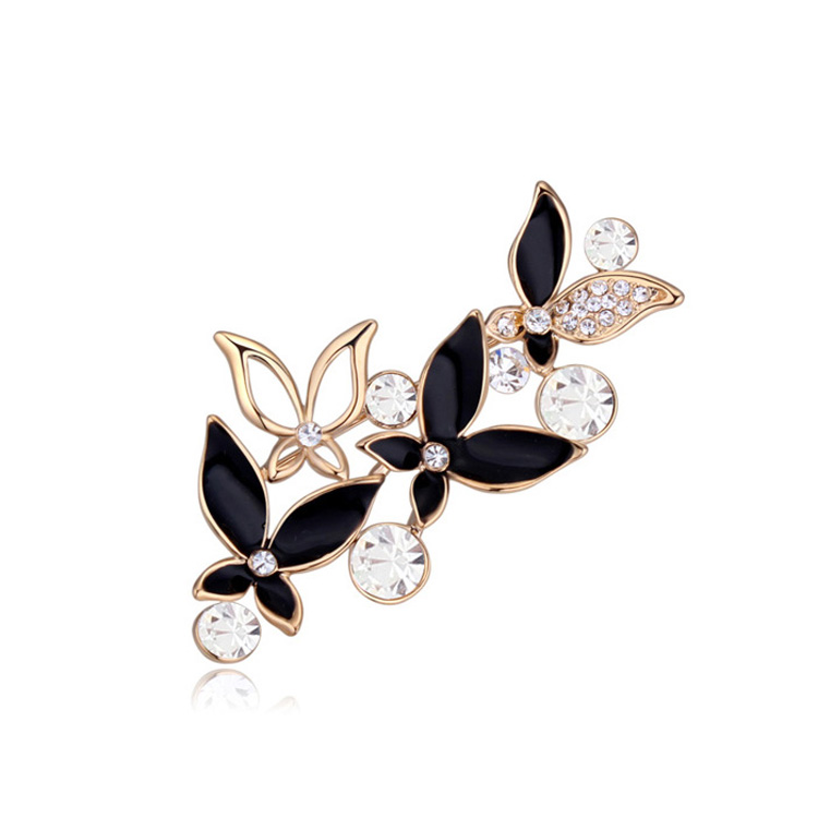 Prendedor en baño de oro amarillo de 18 quilates, diseño de mariposas, con esmaltado negro e incrustaciones de cristales en color blanco. Fabricado en una estructura de aleación de platino con rodio sin níquel.