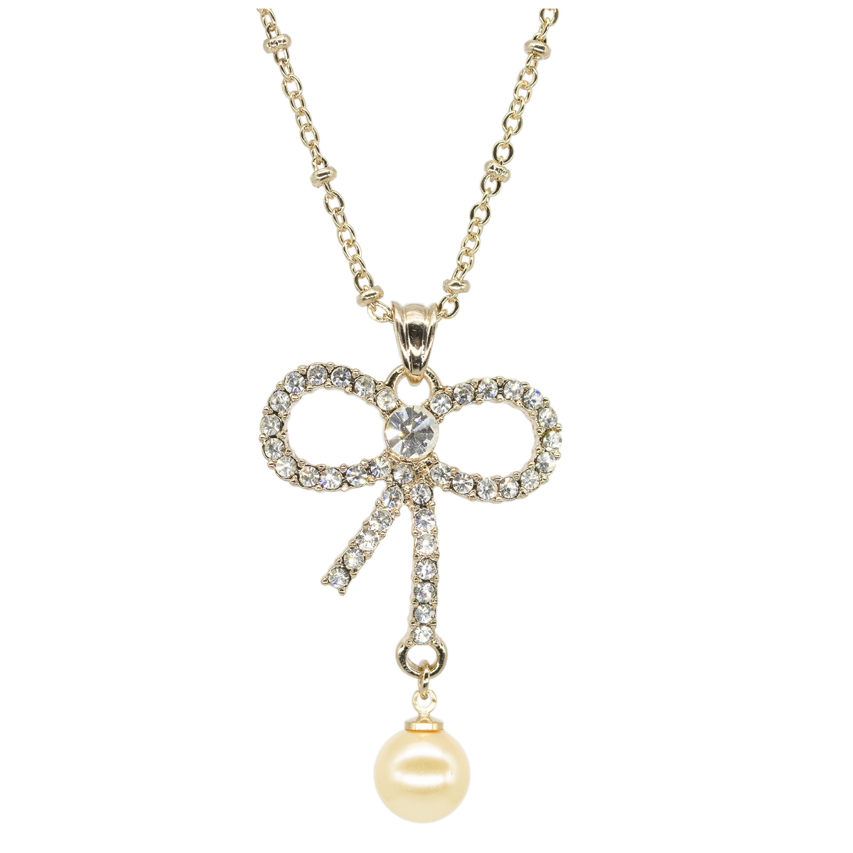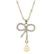 Fino dije con cadena, en baño de oro amarillo de 18 quilates, en forma de moño, con perla beige e incrustaciones de cristales blancos. Fabricado en una estructura de aleación de platino con rodio sin níquel.