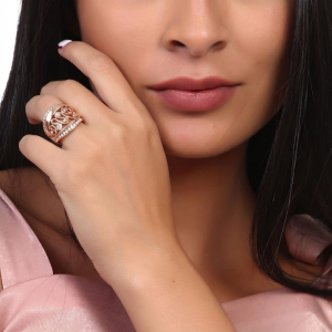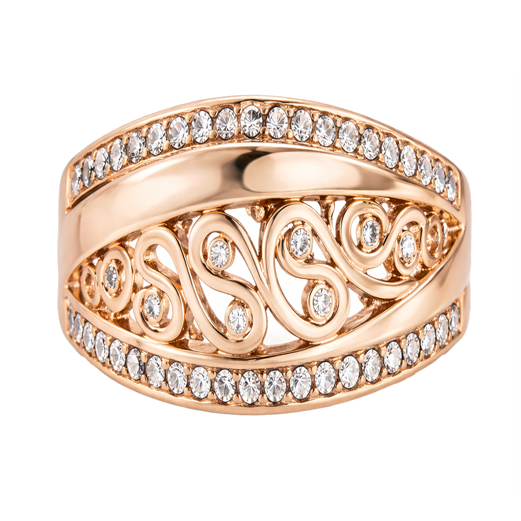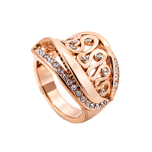 Original y elegante anillo, en baño de oro rosa de 18 quilates, diseño de curvas, con incrustaciones de cristales blancos. Fabricado en una estructura de aleación de platino con rodio sin níquel.