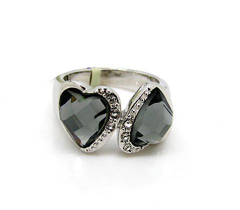 Hermoso anillo, en baño de oro blanco de 18 quilates, con corazones de cristal humo e incrustaciones de cristales blancos. Fabricado en una estructura de aleación de platino con rodio sin níquel.