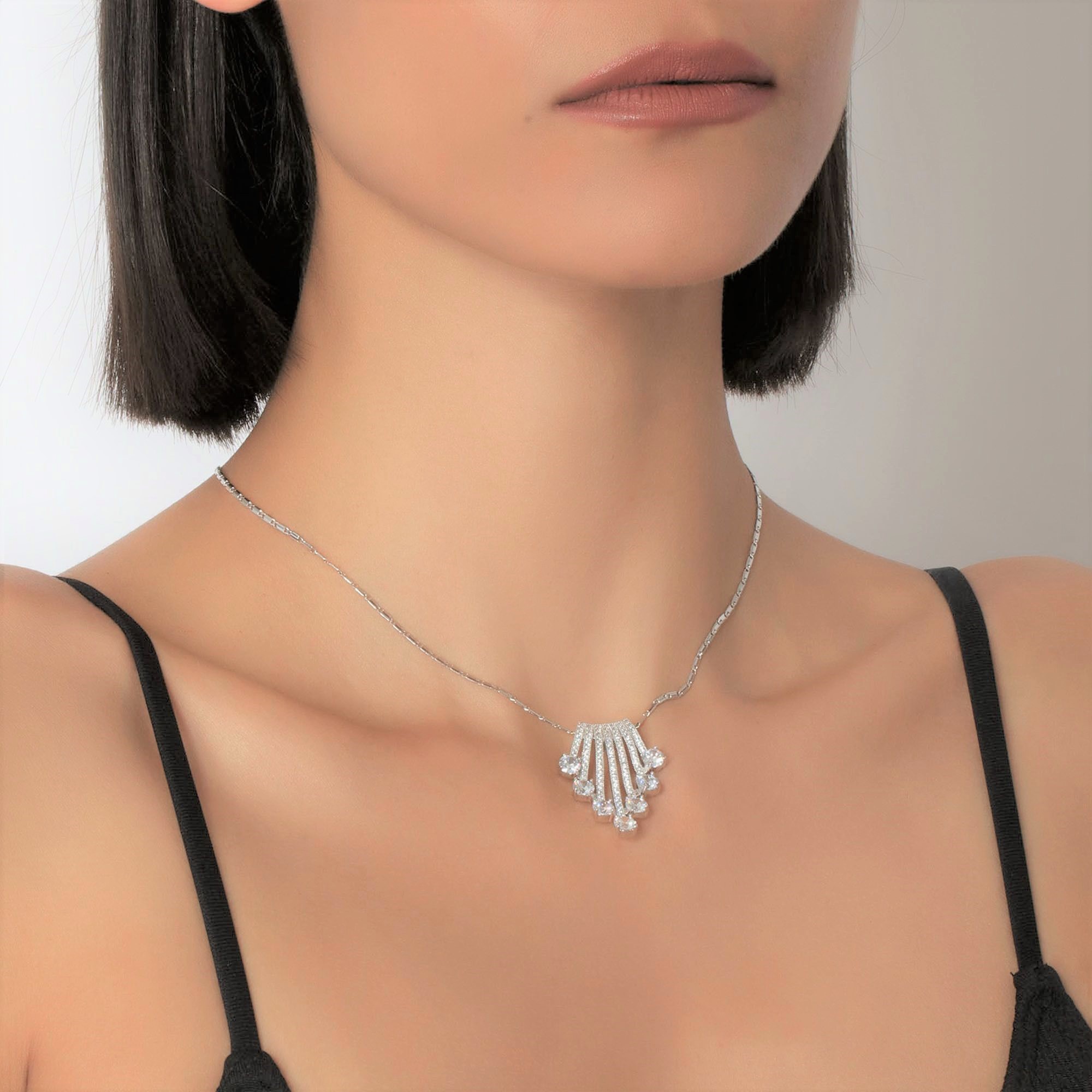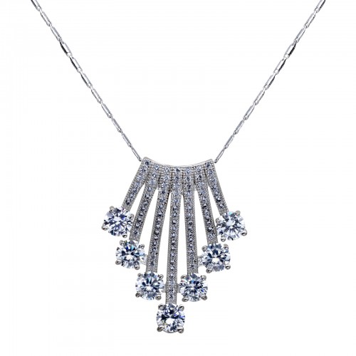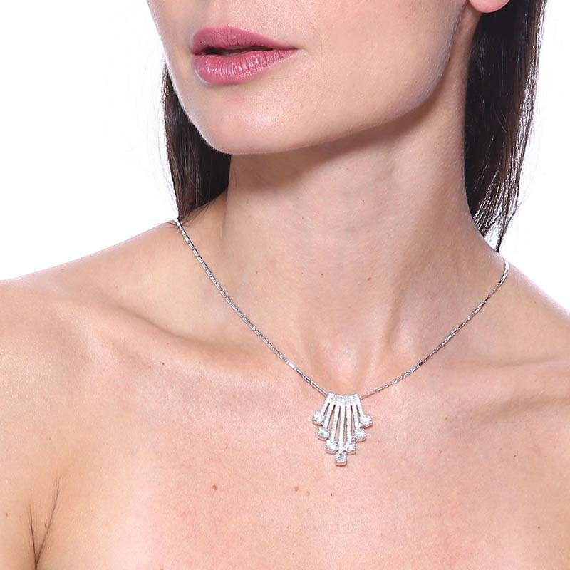 Dije con cadena en baño de oro blanco de 18 quilates , fino diseño con incrustaciones de cristales en color blanco. Fabricado en una estructura de aleación de platino con rodio sin níquel.
