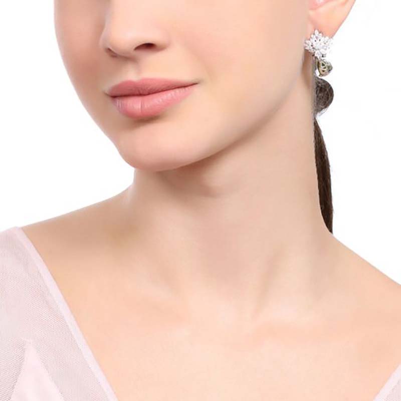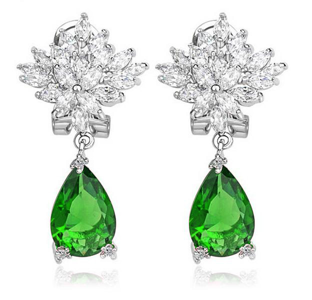 Refinados aretes en baño de en oro blanco de 18 quilates , con cristal verde corte pera e incrustaciones de cristales en color blanco. Fabricado en una estructura de aleación de platino con rodio sin níquel.
