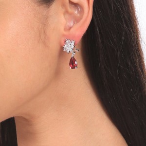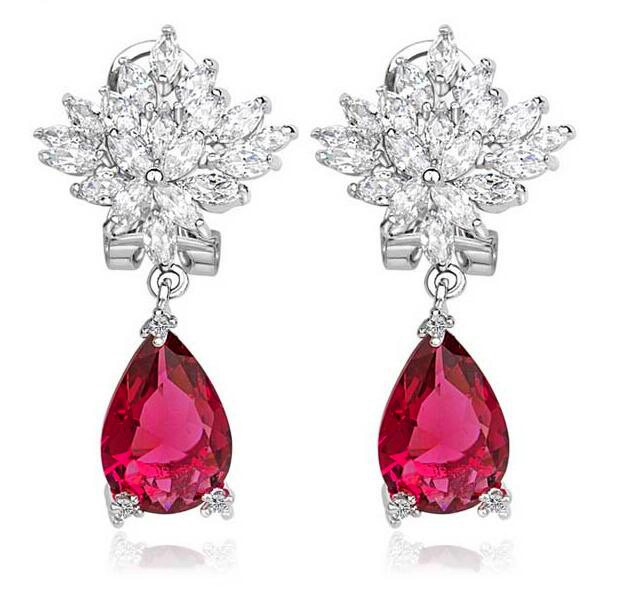 Refinados aretes en baño de oro blanco de 18 quilates , con cristal fucsia corte pera e incrustaciones de cristales en color blanco. Fabricado en una estructura de aleación de platino con rodio sin níquel.