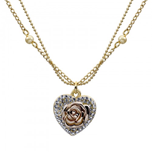 Fino dije con cadenas, en baño de oro amarillo de 18 quilates, en forma de corazón, con detalle de rosa en baño de oro rosado, incrustaciones de cristales blancos y perlas blancas y miel. Fabricado en una estructura de aleación de platino con rodio sin níquel.