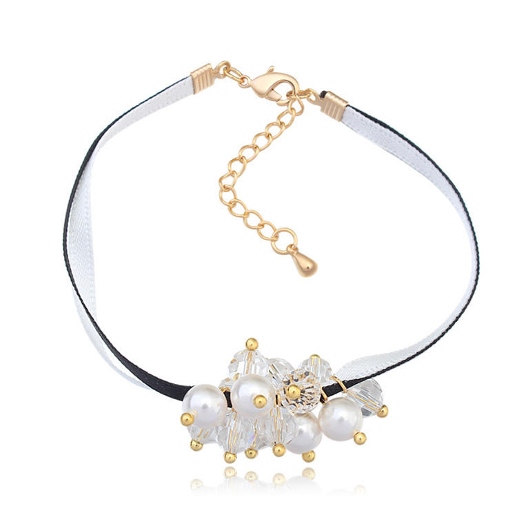 Pulsera en baño de oro amarillo de 18 quilates con correa en color blanco y negro, diseño de perlas y cristales en color blanco. Fabricado en una estructura de aleación de platino con rodio sin níquel.