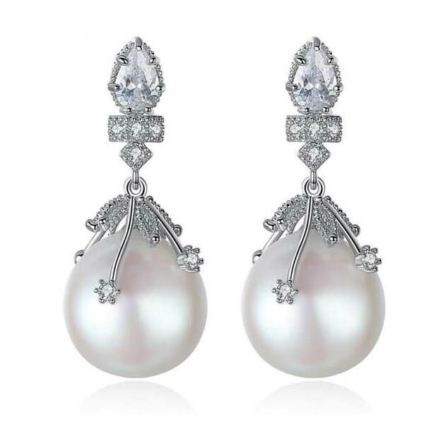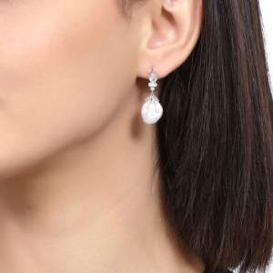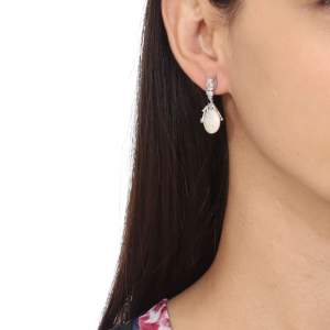 Aretes en baño de oro blanco de 18 quilates con perla madre cultivada, calidad A+ e incrustaciones de cristales en color blanco. Fabricado en una estructura de aleación de platino con rodio sin níquel.