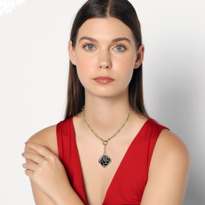 Fino dije, con cadena en baño de oro amarillo de 18 quilates, diseño de cuadro, con rosa calada, acabado satinado, cristal negro sólido dentro, e incrustaciones de cristales blancos. Fabricado en una estructura de aleación de platino con rodio sin níquel.