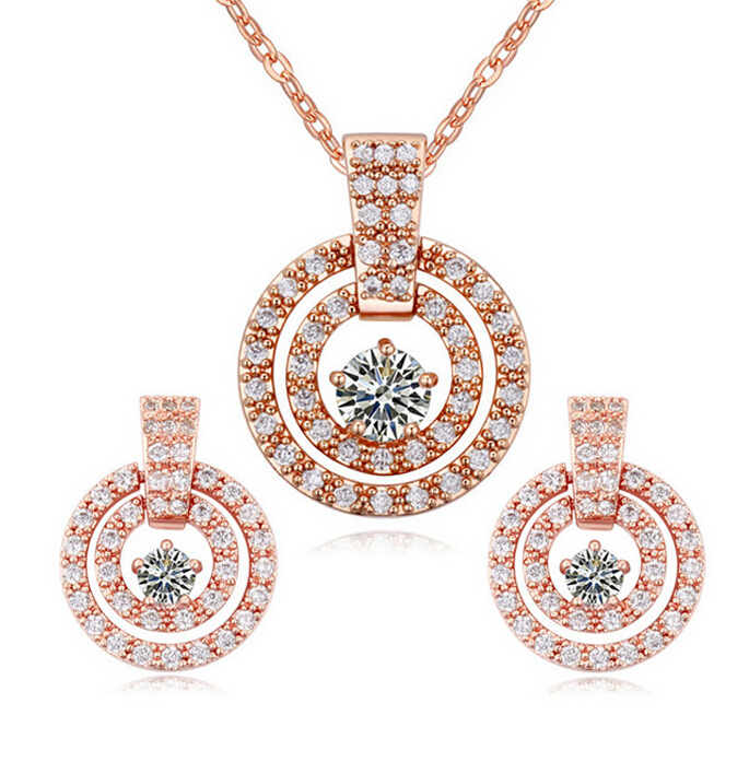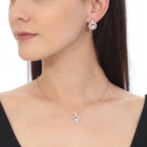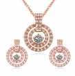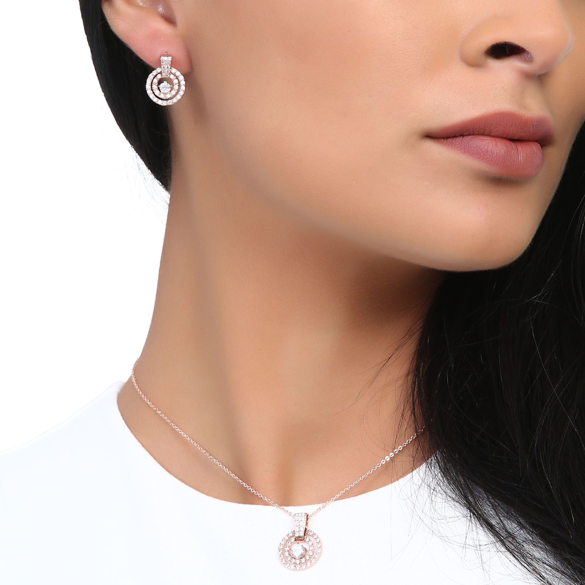 Juego de aretes y dije con cadena en baño de oro rosa de 18 quilates , diseño de aros con incrustaciones de cristales en color blanco.