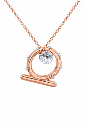 Fino dije con cadena, en baño de oro rosa de 18 quilates, diseño de cierre "Toggle" con incrustaciones de cristales blancos. El collar tiene una cadena de 40 cm con extensión de 5 cm. Fabricado en una estructura de aleación de platino con rodio sin níquel.