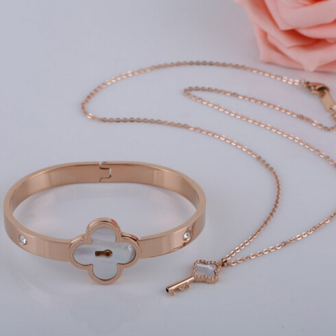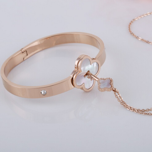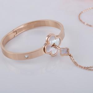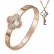 Elegante brazalete en baño de oro rosa de 18 quilates , diseño de cerrojo en forma de flor, con acabado nacarado e incrustaciones de cristales blancos. Fabricado en una estructura de aleación de platino con rodio sin níquel.
