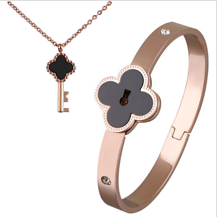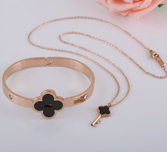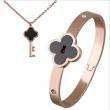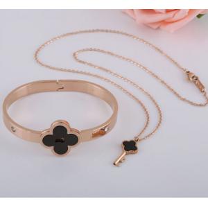 Lindo brazalete en baño de oro rosa de 18 quilates, diseño de cerrojo en forma de flor con acabado esmaltado color negro e incrustaciones de cristales blancos. Fabricado en una estructura de aleación de platino con rodio sin níquel.