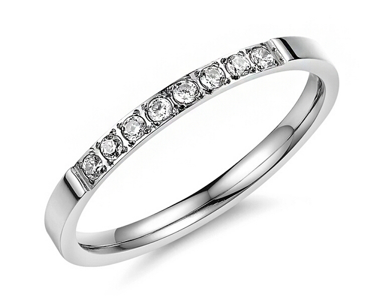 Delicado anillo, en baño de oro blanco de 18 quilates , fino diseño, con incrustaciones de cristales en color blanco. Fabricado en una estructura de aleación de platino con rodio sin níquel.
