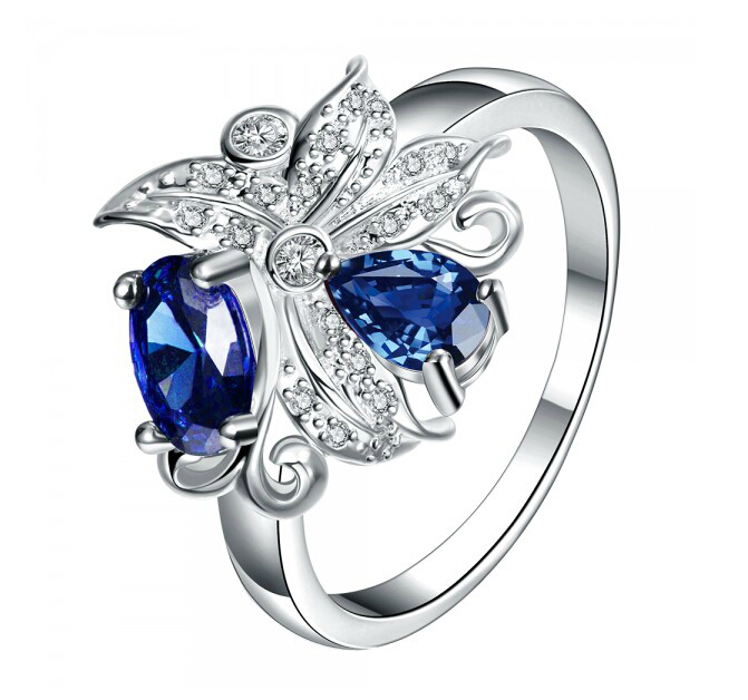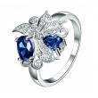 Hermoso anillo de Plata Ley 925, bello diseño de pétalos, con cristales azules corte brillante y corte pera, detalles en relieve e incrustaciones de cristales blancos.