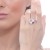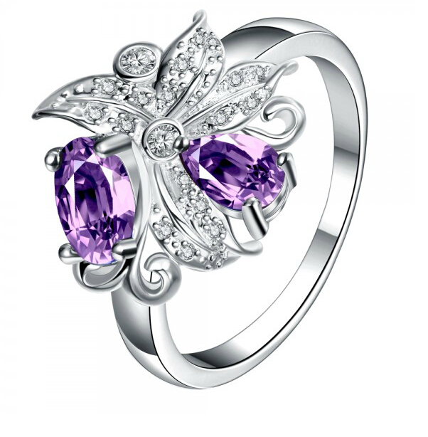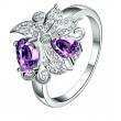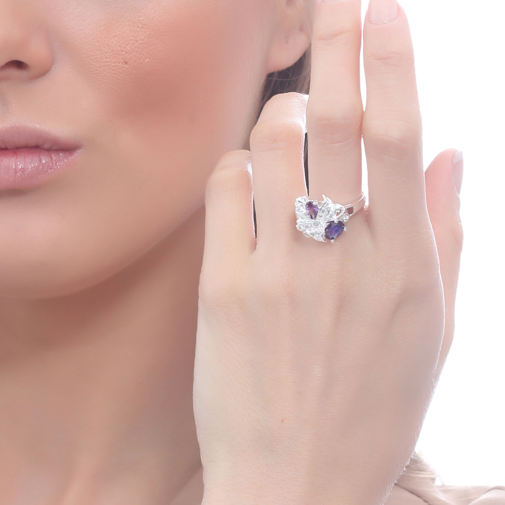 Precioso anillo de Plata Ley 925, diseño de pétalos con cristales morados corte brillante y corte pera, detalles en relieve e incrustaciones de cristales blancos.