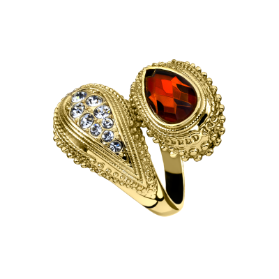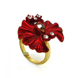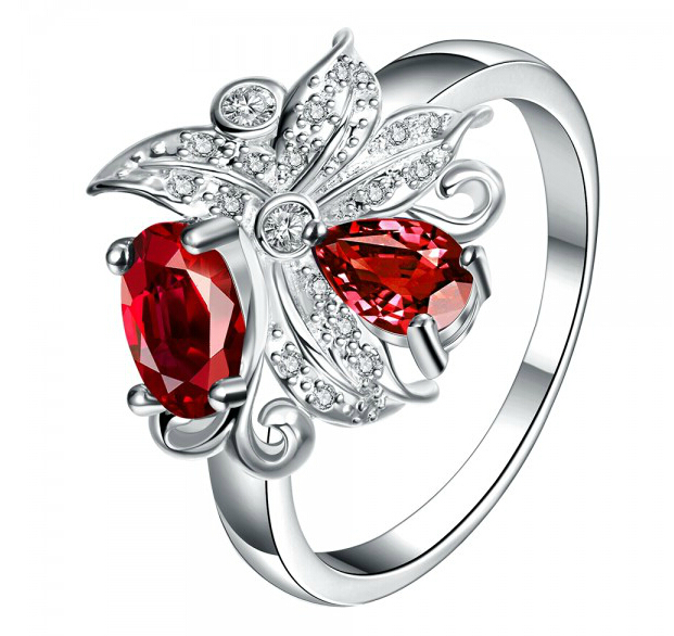 Hermoso anillo de Plata Ley 925, bello diseño de flor, con cristales rojos corte brillante y corte pera, detalles en relieve e incrustaciones de cristales blancos.