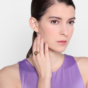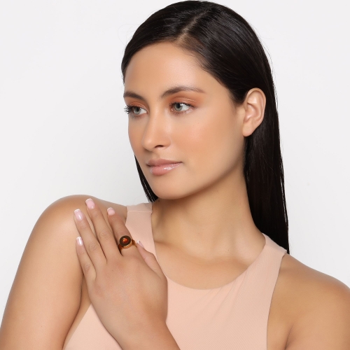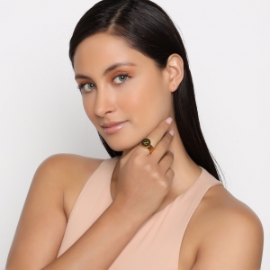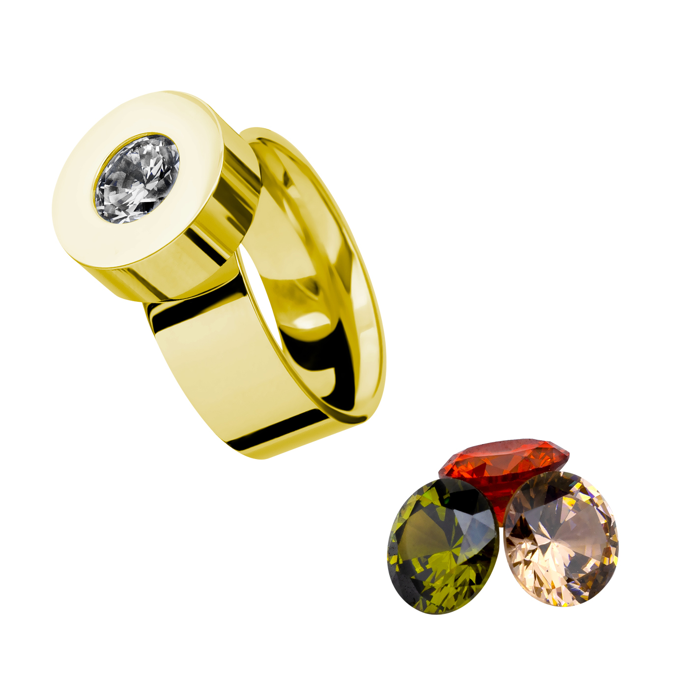 Anillo en baño oro amarillo de 18 quilates, original diseño de circulo, con cristales intercambiables en colores: ámbar, blanco, rojo y verde.