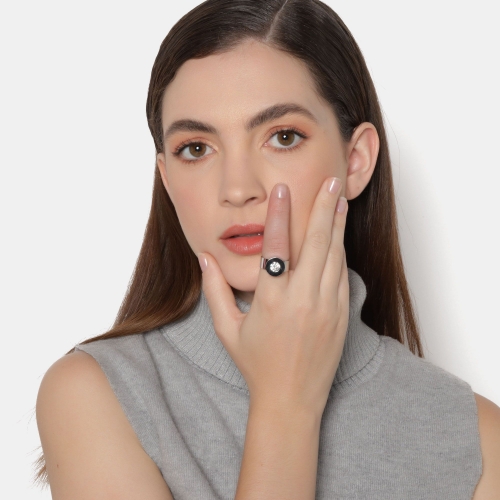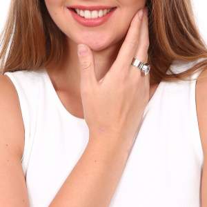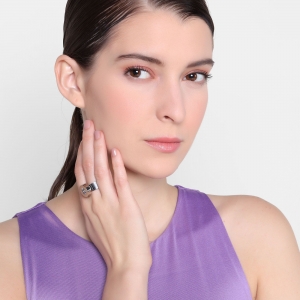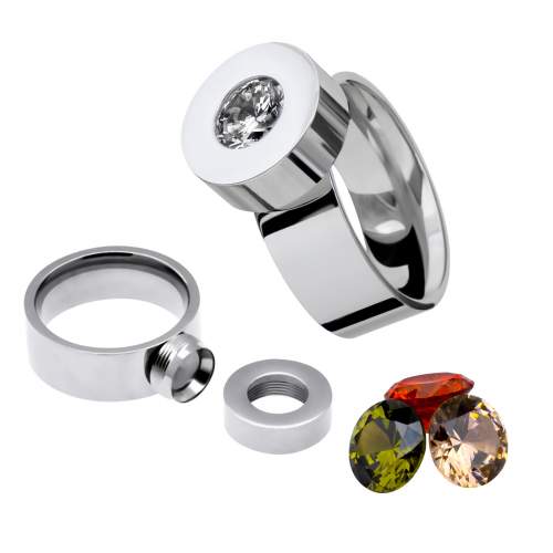 Anillo en baño oro blanco de 18 quilates, original diseño de círculo, con cristales intercambiables en colores: ámbar, blanco, rojo y verde.