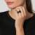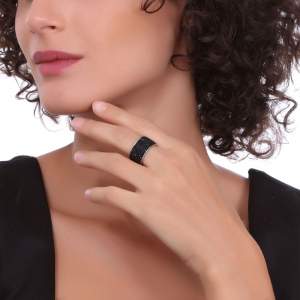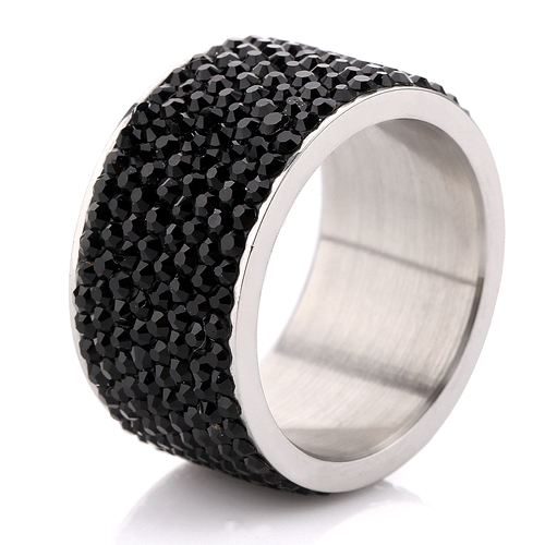 Anillo de acero inoxidable color blanco, fino diseño con incrustaciones de cristales en color negro.