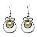 Hermosos aretes, en baño de oro blanco de 18 quilates, diseño de aro con moño plateado, perla blanca e incrustaciones de cristales blancos. Fabricado en una estructura de aleación de platino con rodio sin níquel.