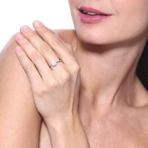 Hermoso y delicado anillo, en baño de oro blanco de 18 quilates , diseño estilo convexo, con incrustación de cristales en color blanco. Fabricado en una estructura de aleación de platino con rodio sin níquel.