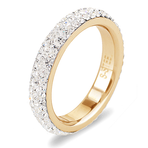 Anillo de acero inoxidable en color amarillo, fino diseño con incrustaciones de cristales en color blanco.
