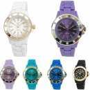 Hermoso Reloj NY, con detalles en baño de oro rosa de 18 quilates, incrustaciones de cristales blancos y correa de plástico, discponible en colores blanco, morado, lila, aqua, azul y negro. Fabricado en una estructura de aleación de platino con rodio sin níquel.