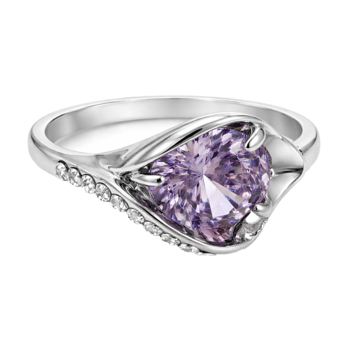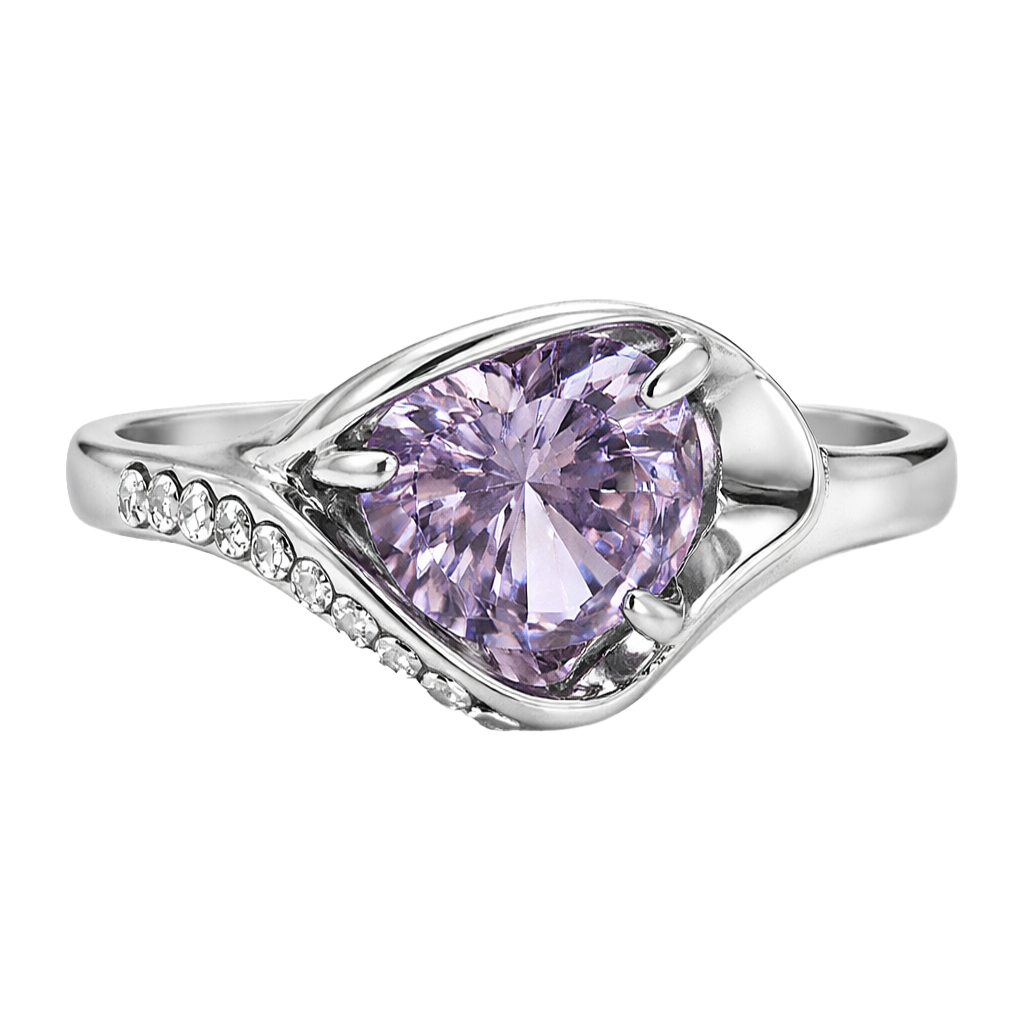 Elegante anillo, en baño de oro blanco de 18 quilates, original diseño, con detalles en relieve e incrustaciones de cristales blancos. Fabricado en una estructura de aleación de platino con rodio sin níquel.