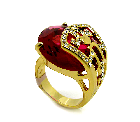 Hermoso anillo, en baño de oro amarillo de 18 quilates, con cristal rojo corte circular, detalles dorados estilo calado e incrustaciones de cristales blancos. Fabricado en una estructura de aleación de platino con rodio sin níquel.