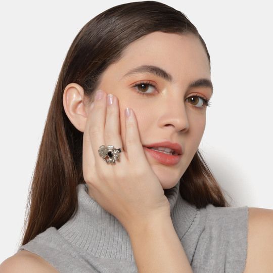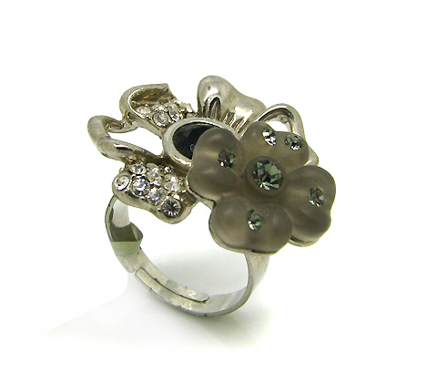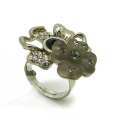 Original anillo, en baño de oro blanco de 18 quilates, con flor de cristal esmerilado color humo, cristal olivo, flor plateada e incrustaciones de cristales blancos. Fabricado en una estructura de aleación de platino con rodio sin níquel.