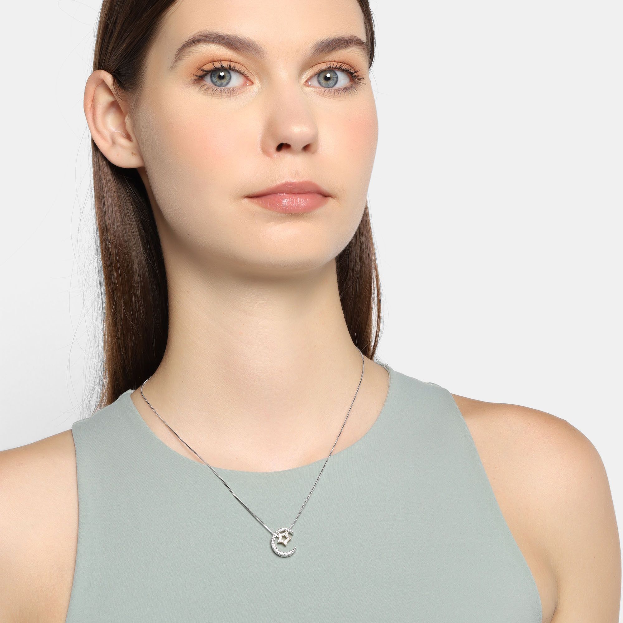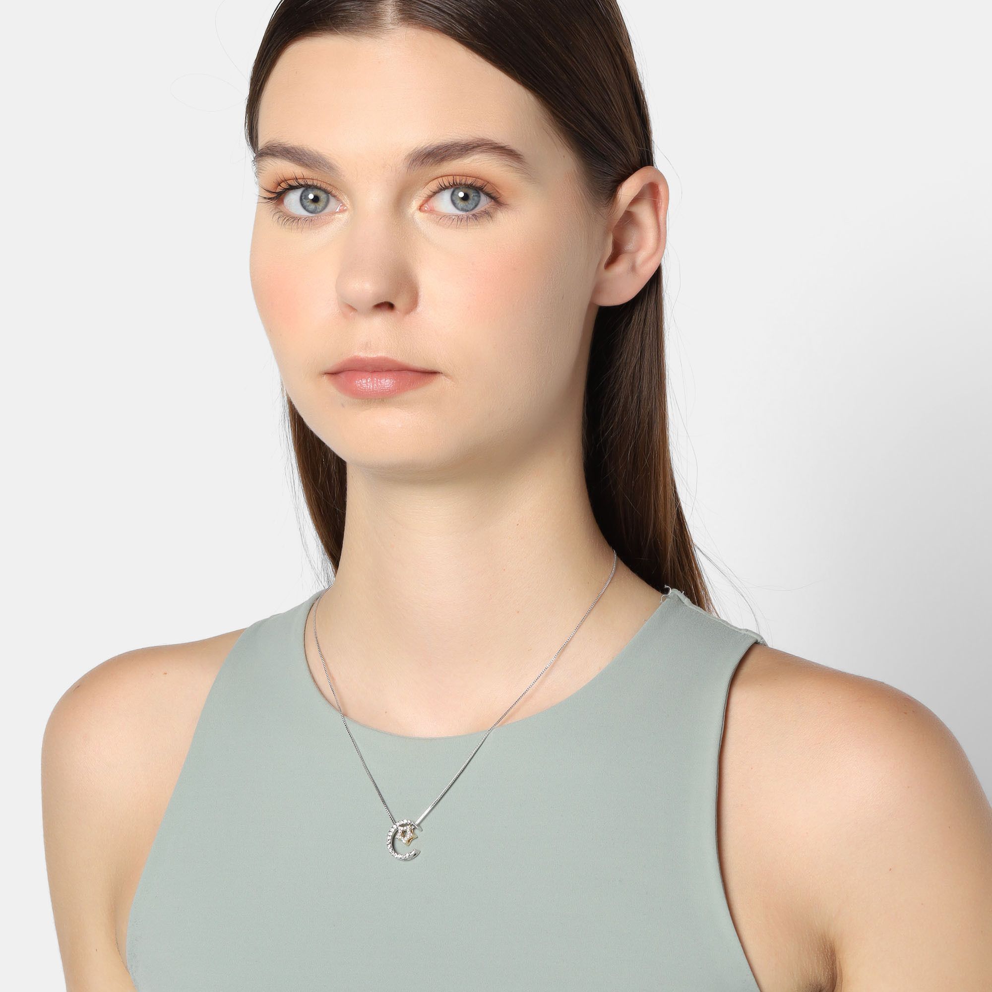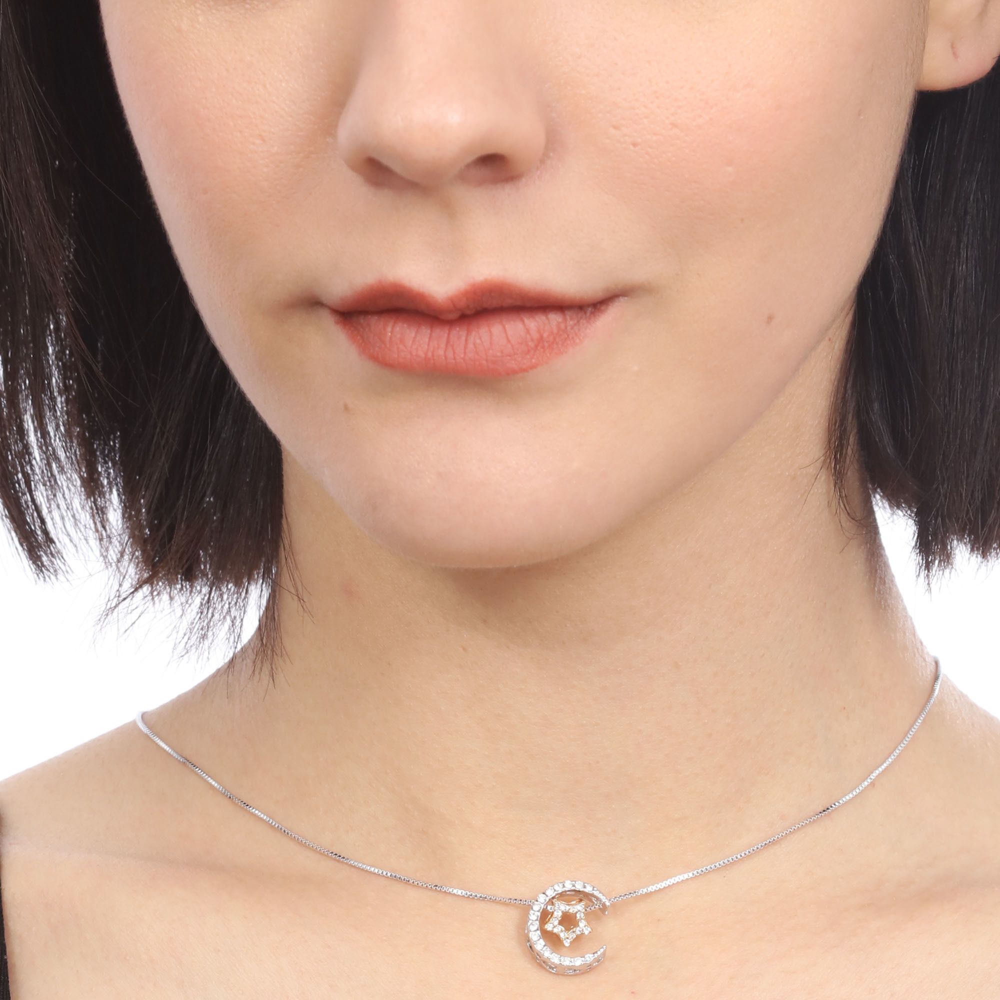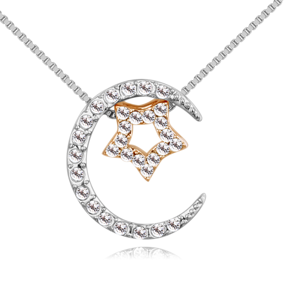 Lindo dije con cadena en baño de oro blanco y amarillo de 18 quilates, diseño media luna plateda y estrella dorada, con incrustaciones de cristales en color blanco. Fabricado en una estructura de aleación de platino con rodio sin níquel.