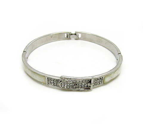 Fina pulsera, en baño de oro blanco de 18 quilates, diseño de hebilla, con acabado nacarado e incrustaciones de cristales blancos. Fabricado en una estructura de aleación de platino con rodio sin níquel.