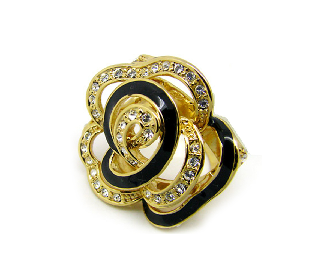 Elegante anillo, en baño de oro amarillo de 18 quilates, diseño de flor en dorado y esmaltado negro con incrustaciones de cristales blancos. Fabricado en una estructura de aleación de platino con rodio sin níquel.