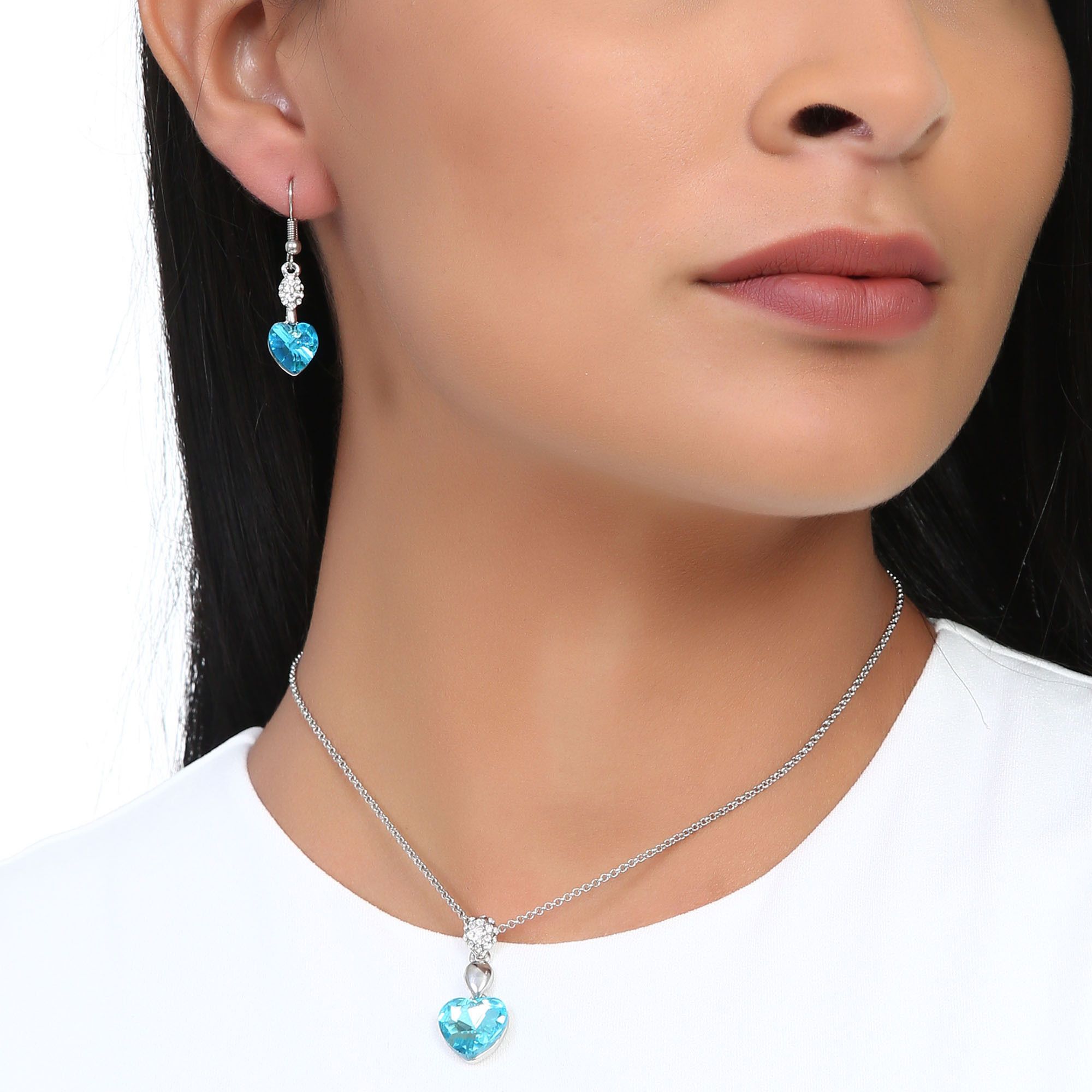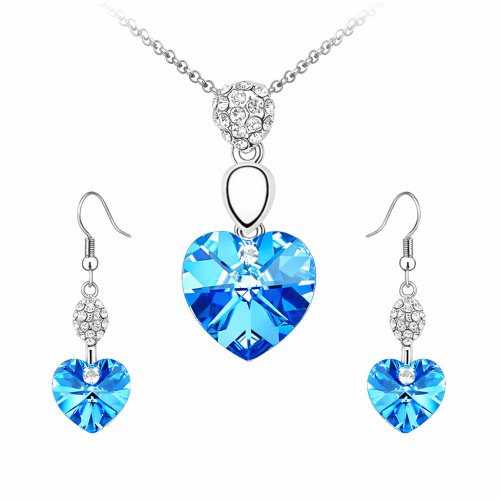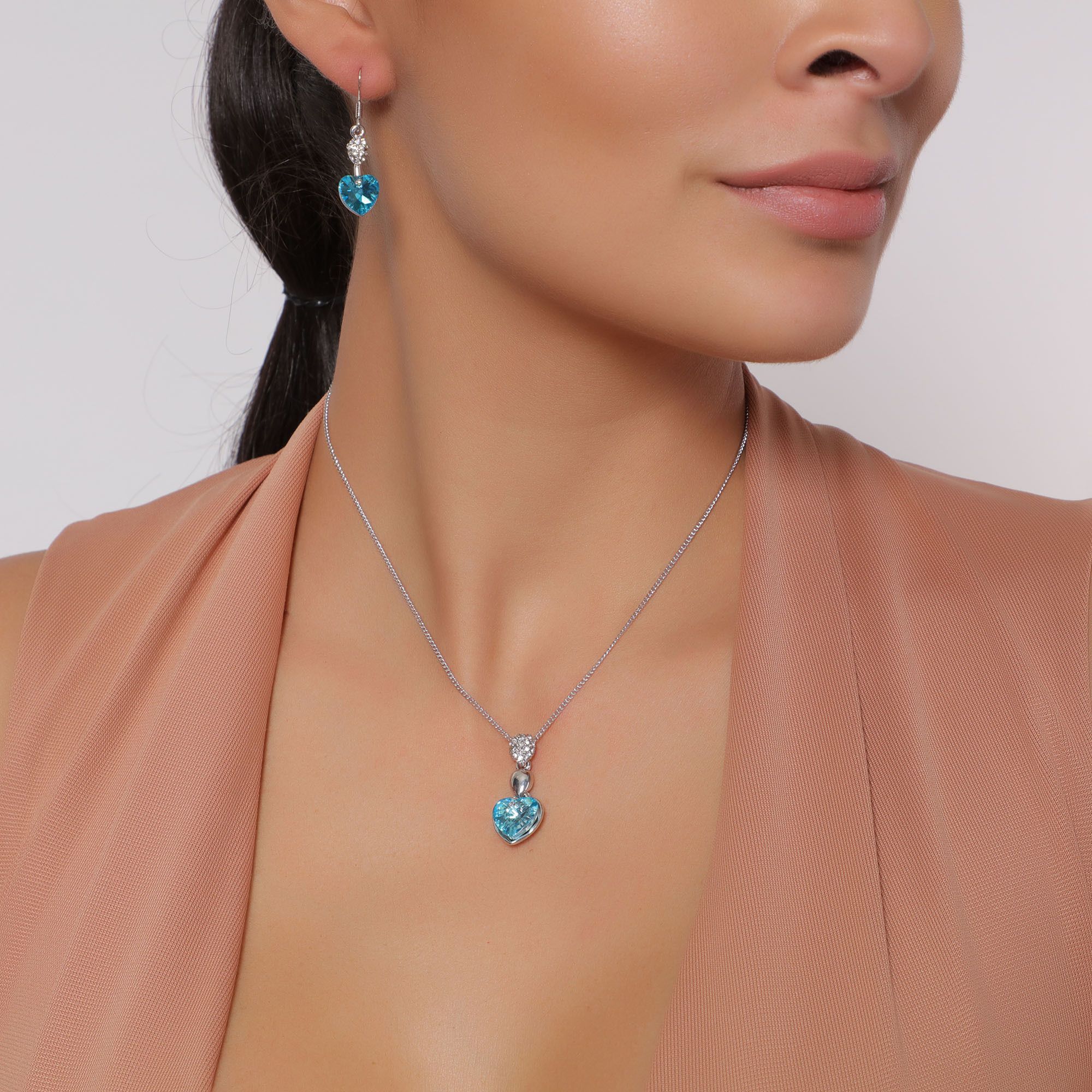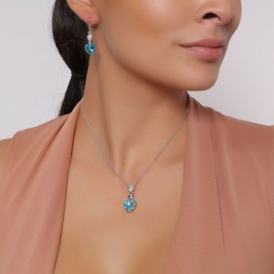 Juego de dije con cadena y aretes, en baño de oro blanco de 18 quilates, fino diseño con corazones de cristal azul, detalles plateados e incrustaciones de cristales blancos.
